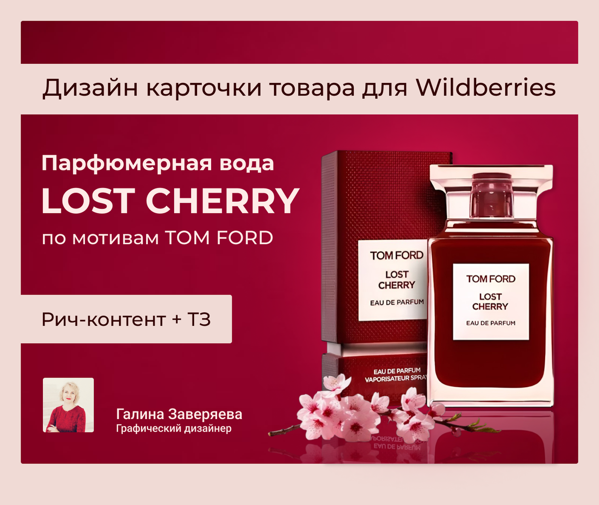 и доступной форме, что способствует лёгкому знакомству потребителей с продуктом и его особенностями. 5. Чередование бордового и нежно-розового фона выделяет парфюмерную воду среди аналогичных предложений, придавая ей стильный и привлекательный вид. 6. В дизайне карточки используется шрифт Montserrat, что создаёт ощущение современности и элегантности, поскольку он близок к шрифту, использованному на упаковке товара. Для подзаголовков применяется шрифт Robot