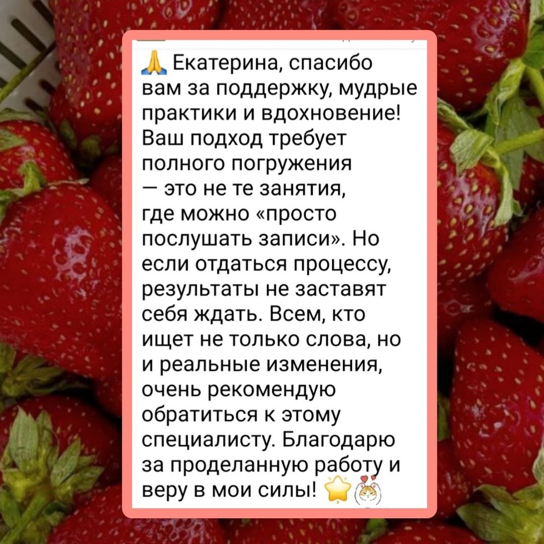 Вот такие невероятно приятные и глубокие отзывы получаю от своих клиентов❤️ Я знаю, что многие "зреют" на личную работу. И это меня радует и вдохновляет на создание новых продуктов. Тариф "Летнее настроение" — ваши внутренние трансформации на лайте — включает в себя: 🌼три личные консультации 🌼три аудио практики для освобождения от страха, наполнения энергией и ощущения целостности 🌼поддержка и ответы на ваши вопросы между встречами. Благодарю вас за ваши отклики и жду вас в личную работу. Чтобы узнать подробности о тарифе "Летнее настроение", пишите мне в личку "ЛЕТО" @Ekaterina_T_Psy #отзывы