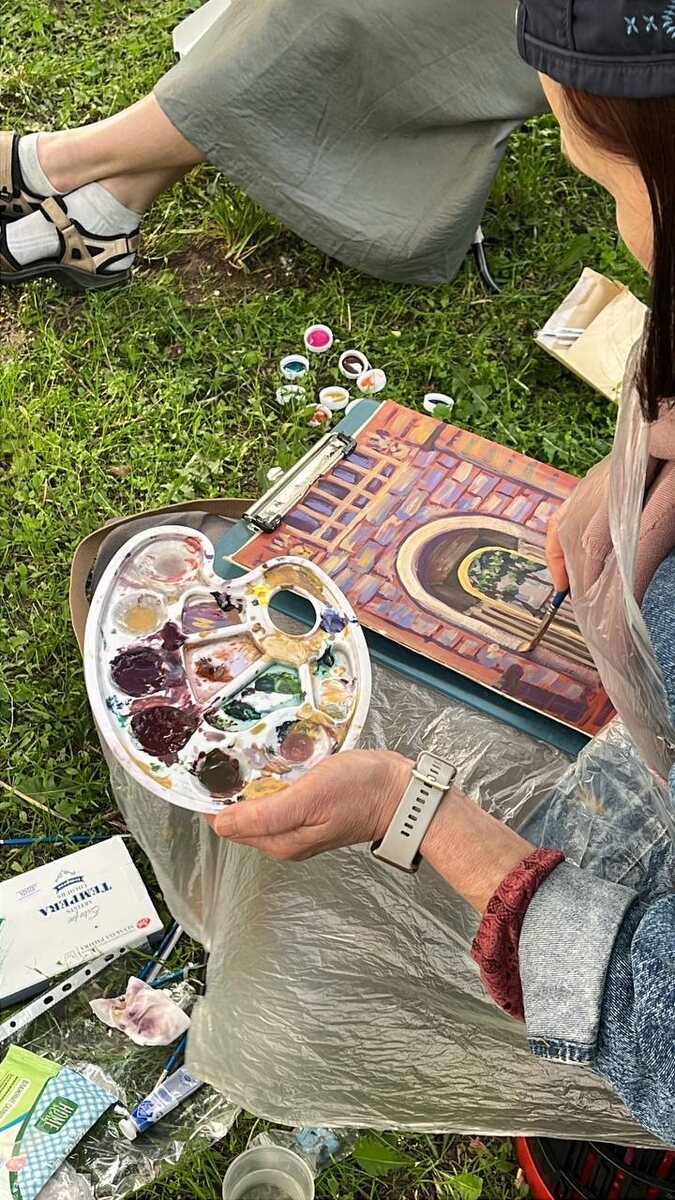 Участники посетили мастерские, купили принты акварелей, увидели, как проходит жизнь на московском Монмарте и написали этюды гуашью!