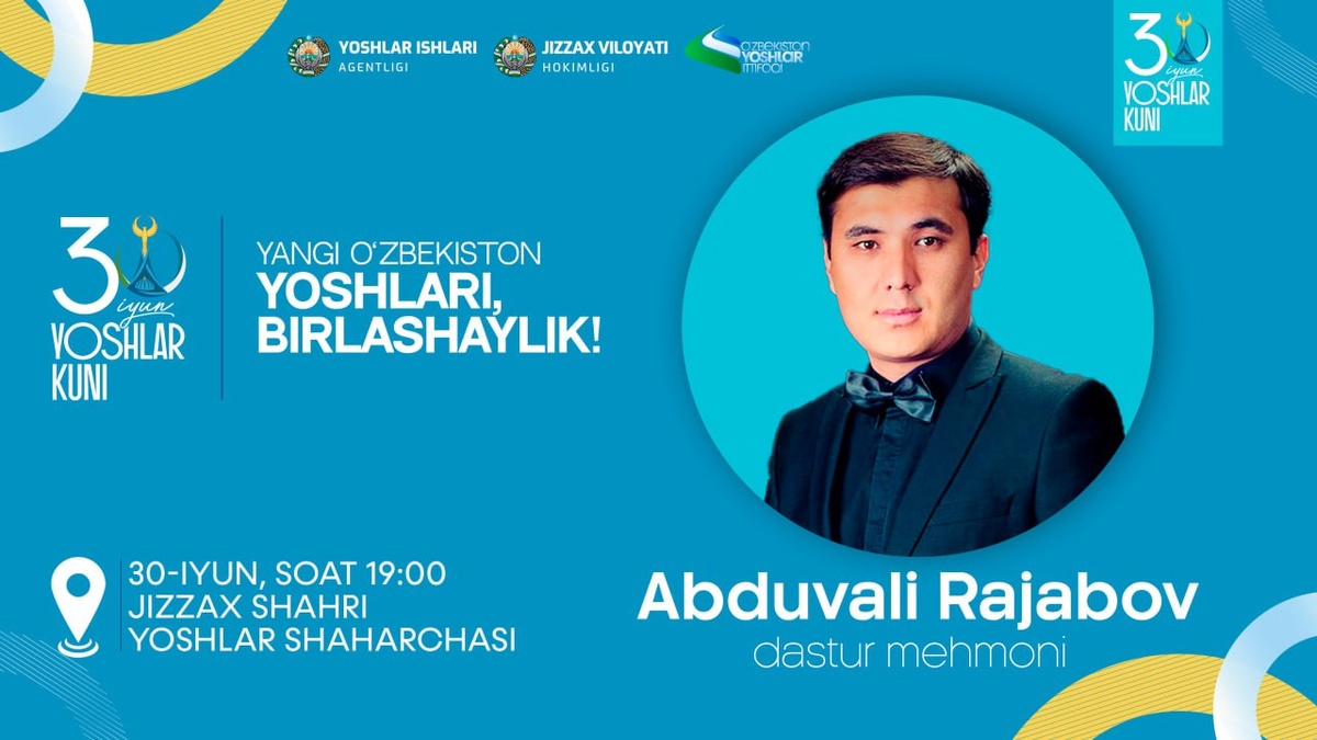 Сизларни 30 июнь - "Ёшлар куни" муносабати билан эстрадамизнинг ёрқин юлдузлари, халқимиз севган хушовоз хонандалари иштирокидаги шоу-концерт дастурида кутамиз.