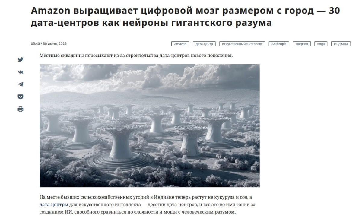 Результат предсказуем: местные скважины пересыхают, болота засыпают под фундаменты. Жители бьют тревогу — их питьевая вода уходит на охлаждение нейронов искусственного разума! 💧