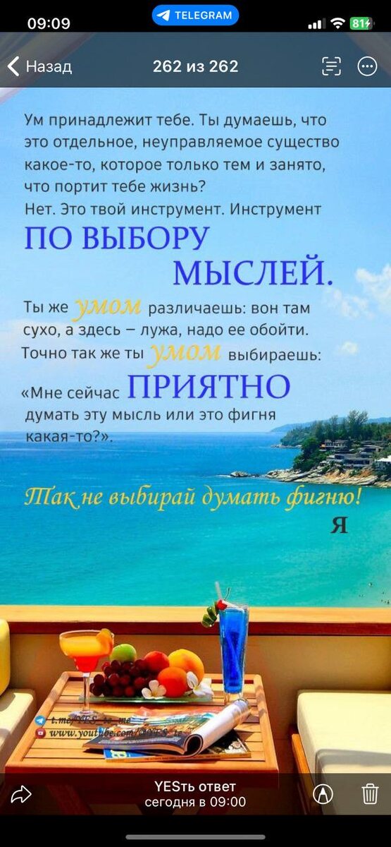 Мой ум несогласен…, мой ум сопротивляется …мой ум мне говорит… мой ум не хочет… Рили? Вы всерьез думаете , что ум чего-то там «хочет» или «не хочет»?) Вы всерьез думаете, что ум чего -то там может вам запретить или с чем -то «не согласиться» и все- прощай , желаемое?) Вы всерьез думаете, что ум это прям причина, чтобы вы могли отъехать на него ? Типа «у меня не получилось стать изобильной , мне мой ум не разрешил». У меня не получилось создать дом, машину, тело, отношения… потому что мне мой ум не разрешил… Что -то вроде «не получилось сегодня позавтракать, правая рука запретила мне брать ложку , чтобы я могла поесть». Ум это ваш инструмент. Направьте его туда, куда вам нужно. Дайте ему то направление мыслей, в котором вам приятно думать/смотреть. Не выдУМывайте , что ум вам мешает смотреть туда, куда вы хотите. Бросьте прятаться за этой отмазкой. ❓Задать вопрос 👋 здесь Пообщаться с единомышленниками и СО-творцами, попасть на прямой эфир про близких и родных здесь 🤩 🛎️Клуб: Уди