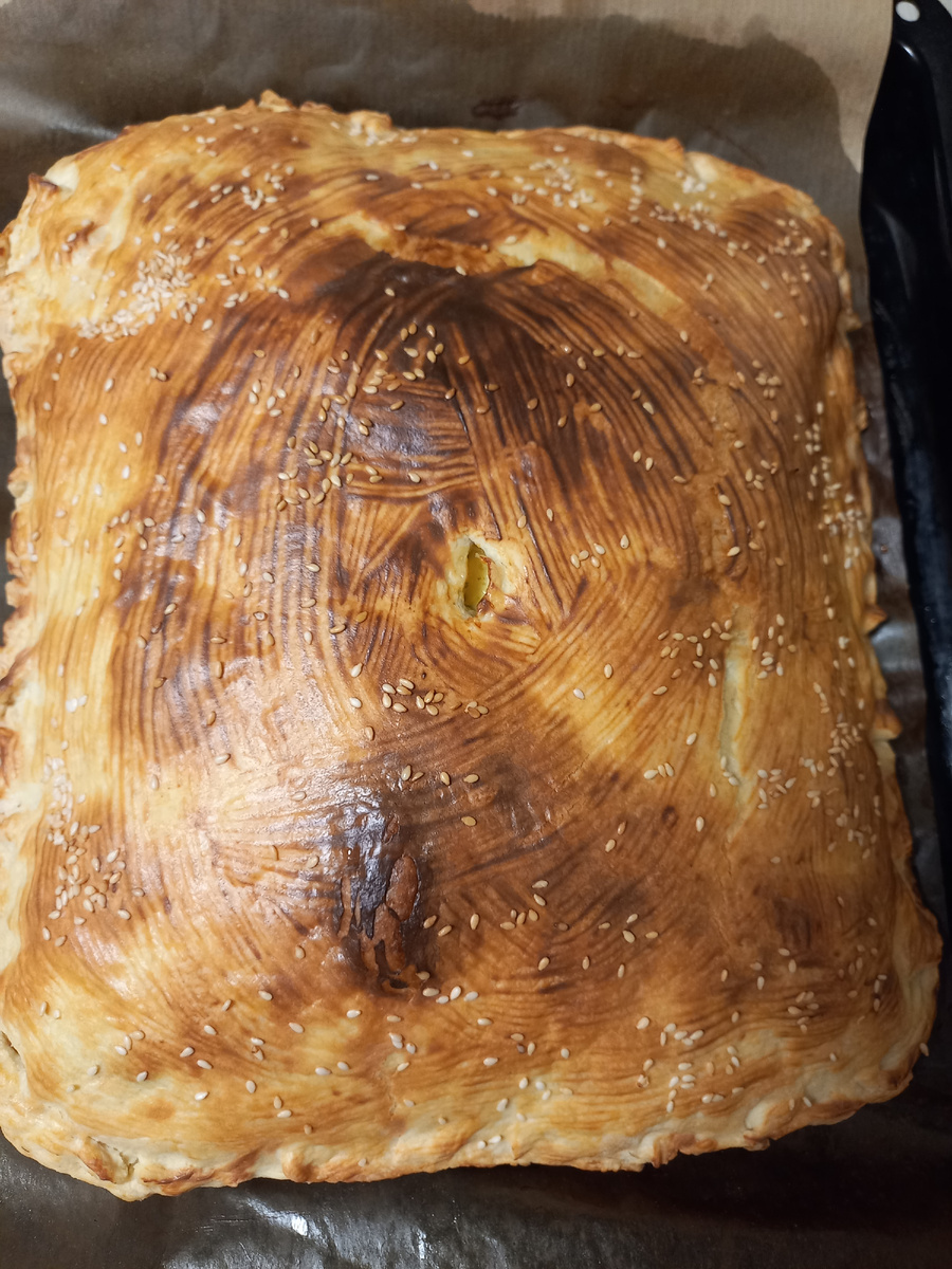 Всем привет! Вчера готовила сырный пирог из слоеного теста, получилось очень вкусно и он "разлетелся на Ура". Хрустящее тесто и много сырной "тянущейся" начинки это было божественно. Еще в начинке была зелень: укроп и кинза. Укроп дал свежесть, а кинза придала пирогу пикантность и немного восточного аромата. Готовить не сложно и ингредиентов требуется по минимуму, но результат классный. Такой пирог можно подать как к чаю, так и на посиделки с вином. Способ приготовления: Первым делом включаем духовку нагрев верх/низ, температура 180 градусов. Теперь можно приступить к приготовлению пирога. Сыр натираем на крупной терке, перекладываем в чашку. В чашку к сыру разбиваем яйцо и добавляем сметану. Сливочное масло нужно растопить. Я топила с помощью микроволновки. Добавляем растопленное сливочное масло к сыру и остальным ингредиентам. Начинку хорошо перемешиваем до однородной массы. У меня сыр был не слишком соленый, я добавила еще немного соли в начинку. Противень застилаем пергаменто