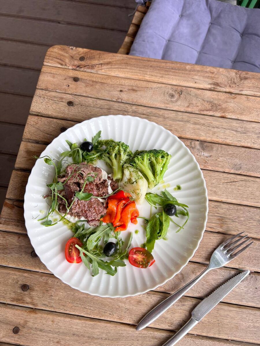 Говядина медиум с соусом Де-Бланж на основе белых Грибов и творожного сыра а так-же маслин