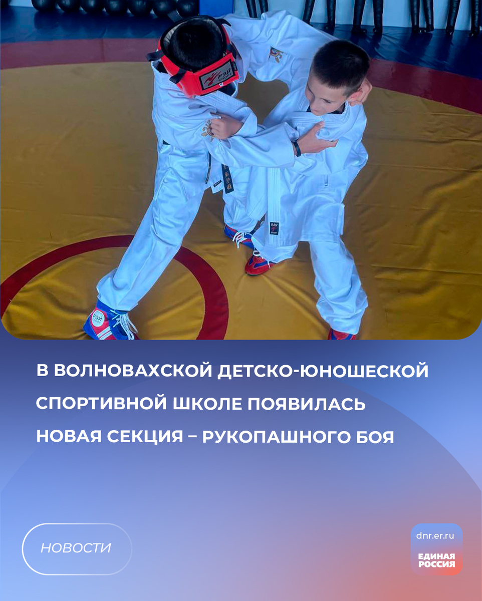 ✊ В Волновахской детско-юношеской спортивной школе появилась новая секция – рукопашного боя. В ней дети будут заниматься спортом по партийным проектам Единой России «Детский спорт» и «Выбор сильных». Для полноценного старта тренировок шеф-регион Волновахи – Ямал передал всю необходимую экипировку: кимоно, самбетки, шлемы, перчатки, бандажи, накладки, защиту на грудь, брендированные футболки – всего 54 единицы. Дополнительно в спортзал доставили судейскую вышку, эспандеры и аптечки первой помощи.
