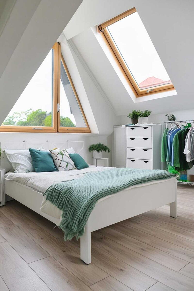 Вы можете с пользой использовать свой чердак, превратив его в стильную и уютную спальню для подростка. Прежде чем приступить к декору, вы должны убедиться, что в спальне достаточно света. Несколько мансардных окон — идеальный выбор для этой цели. Что касается интерьера, спросите своего ребенка о его цветовых предпочтениях или придерживайтесь нейтральных оттенков. Сочетание белых и кремовых оттенков, увенчанное акцентными оттенками, такими как бирюзовый, внесет успокаивающий эффект в общую расслабляющую атмосферу комнаты.