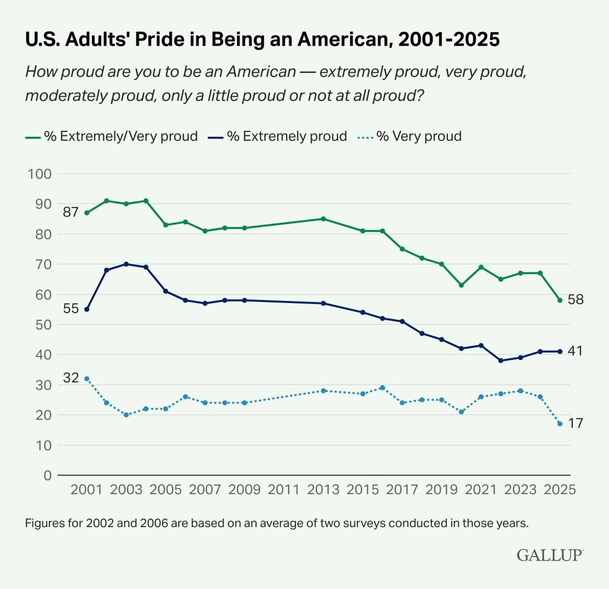 Just 58% of Americans now say they're 'extremely' or 'very' proud — a 9-point drop from 2024