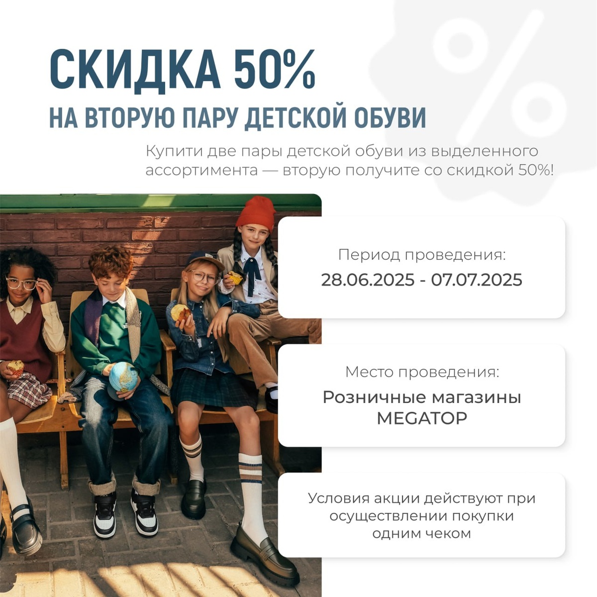 🩷-50% на вторую пару детской обуви🩷 ✨С 28 июня по 7 июля успейте купить две пары детской обуви из выделенного ассортимента — вторую получите со скидкой 50%! ☉ Место проведения: розничные магазины MEGATOP ☉ Срок действия: 28.06.2025 - 07.07.2025 ☉ В акции участвуют: список детского акционного ассортимента Подробнее ознакомиться с условиями акции можно по ссылке: ➡️MEGATOP.BY