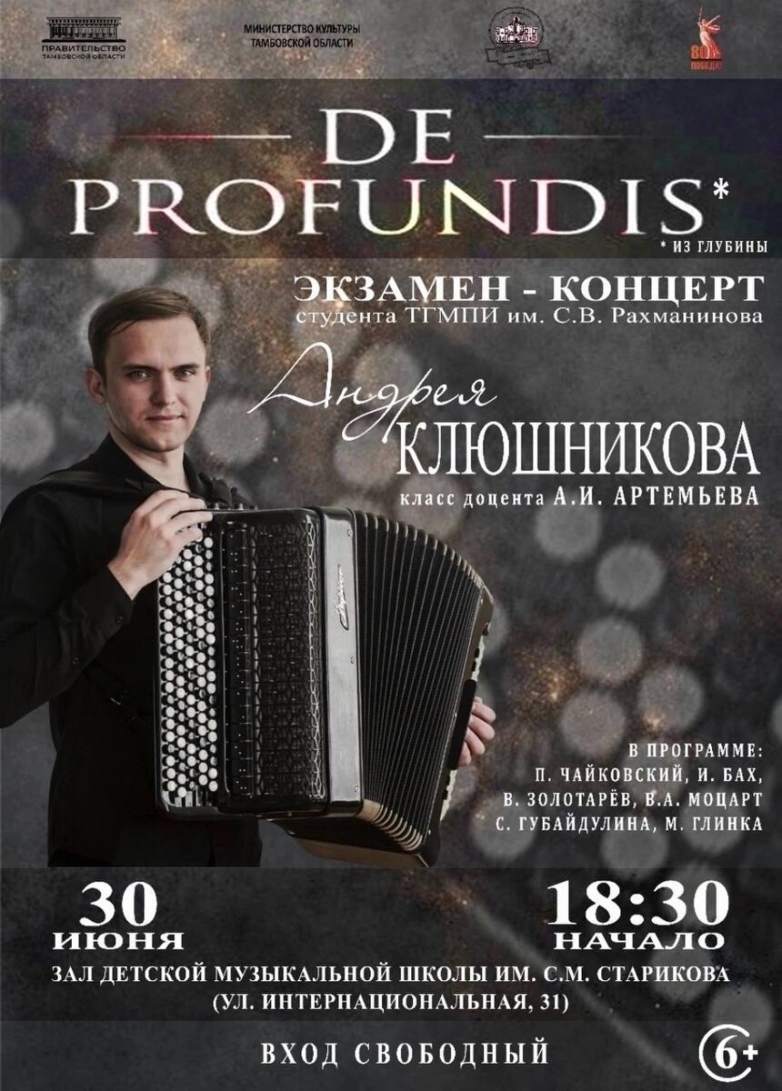 🎵DE PROFUNDIS - ИЗ ГЛУБИНЫ🎵ЗАВТРА - 18:30🎵 ❣️30 ИЮНЯ студент 3 курса ТГМПИ им. С.В. Рахманинова (класс доцента Артемьева А. И.), артист ансамбля "Тамбовъ" Андрей Клюшников выступит в зале Детской музыкальной школы им. С. М. Старикова с сольным концертом под названием "DE PROFUNDIS". В программе концерта прозвучат сочинения христианской тематики таких композиторов, как И. С. Бах, В. А. Моцарт, М. Глинка, П. Чайковский, Вл. Золотарев, С. Губайдулина. Зал Детской музыкальной школы им. С. М. Старикова (ул. Интернациональная, 31) 🎟️6+ / Вход свободный. #30июня