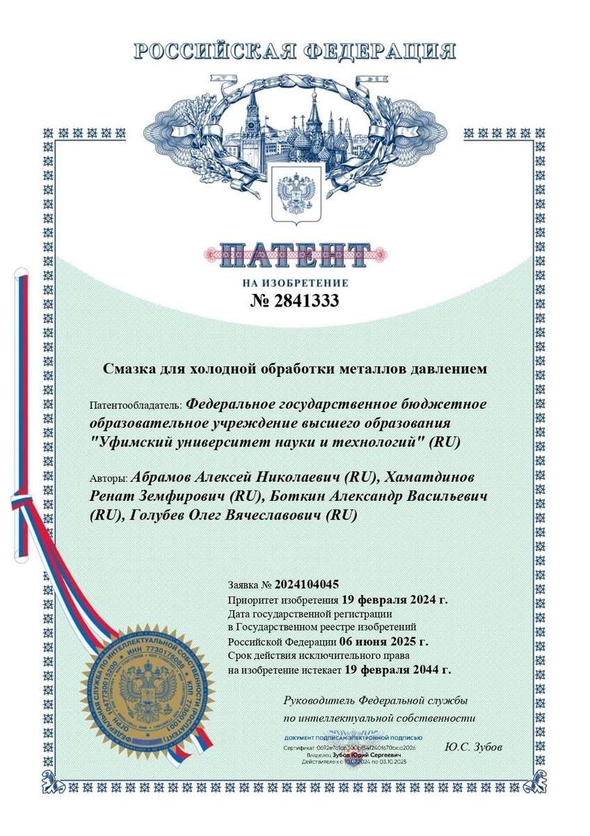 Ученые Уфимского университета науки и технологий создали инновационную смазку для холодной обработки металлов давлением. Изобретение успешно прошло государственную регистрацию в Федеральной службе по интеллектуальной собственности (Роспатенте) По итогам июня текущего года Роспатент признал разработку уфимских ученых одной из лучших в стране и присвоил звание «Патент недели».