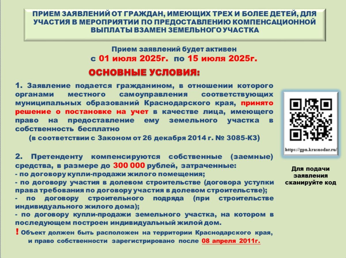 😮С 1 по 15 июля объявлен приём заявлений от граждан, имеющих трёх и более детей, об участии в мероприятии по получению компенсационной выплаты взамен земельного участка.