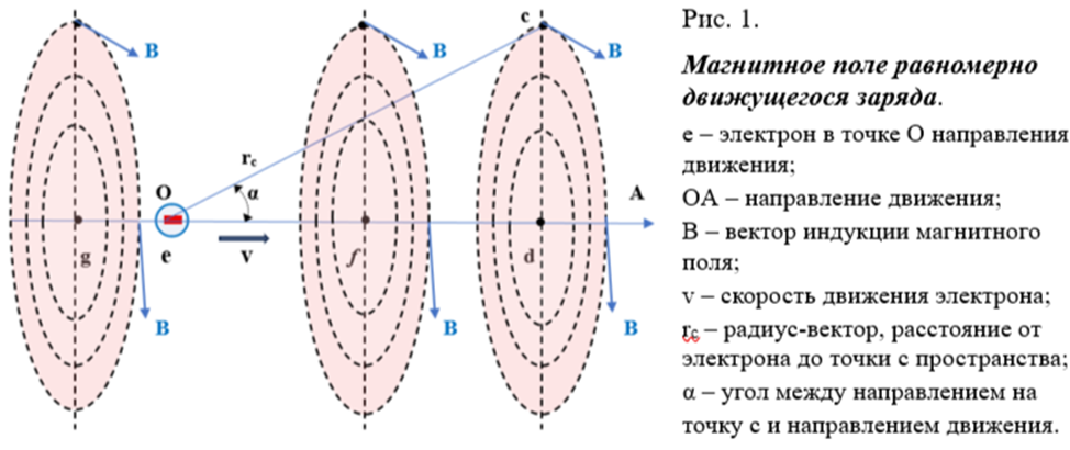 Из электродинамики известно, что равномерно движущийся электрический заряд порождает магнитное поле, силовые линии магнитной индукции B которого на плоскости ортогональной направлению движения образуют вложенные друг в друга концентрические окружности, центр которых лежит на линии направления движения заряда (см. Рис. 1).