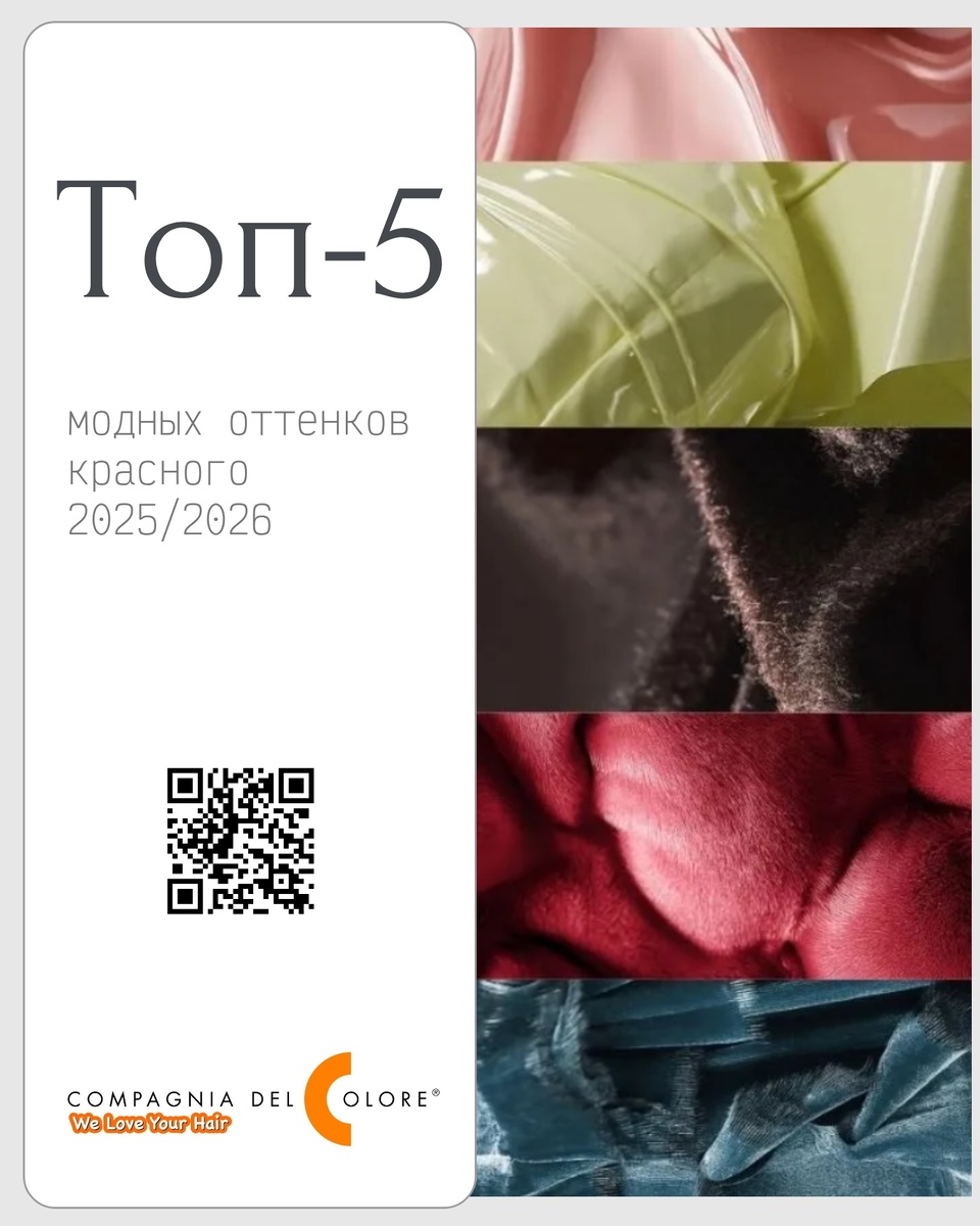 Тренды, которые вас вдохновят! Сезон 2025/2026 - время глубоких, насыщенных и эмоциональных красных оттенков. От вишневого цвета до ярко алых оттенков - выбирайте трендовые тона, которые покорят ваше сердце! Fig — Инжир - Фруктовый и древесный оттенок с нотками фиолетового, привносящий в палитру экзотичность и загадочность. Идеален для смелых модниц и акцентных окрашиваний Winterberry- Зимняя ягода - Насыщенный красно-розовый, напоминающий заснеженные ягоды. В тренде - градиенты с этим оттенком и матовые текстуры. Используется в техниках “балаяж” и “шатуш” для естественного перехода. Chocolate Martini — Шоколадный мартини - Роскошный насыщенный коричневый оттенок с бархатистой текстурой, создающий ощущение тепла и изысканности Brandied Melon — Бренди дыня - Приглушенный оранжево-розовый, воплощает уютную роскошь и комфортную элегантность. Теплый и насыщенный цвет, сочетающий в себе нотки оранжевого и розового, придающий образу уют и элегантность Chili Oil — Масло чили - Яркий и насы