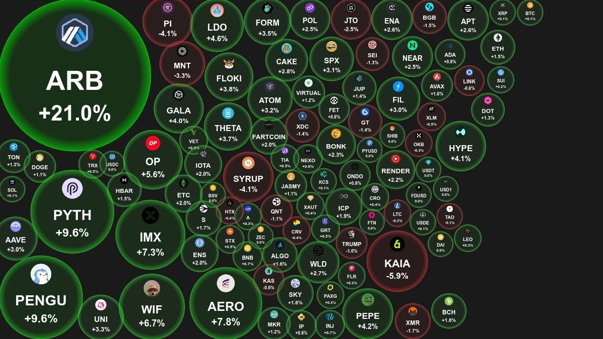 📊 Ежедневный обзор рынка криптовалют от Coinbubbles.ru 🗓 30.06.2025 11:06 по Москве. 🔗 Посмотреть на сайте 📈 Лидеры роста (из ТОП-100): 🟢 Arbitrum (ARB): $0.3754 (+21%) 🟢 Pudgy Penguins (PENGU): $0.0147 (+9.6%) 🟢 Pyth Network (PYTH): $0.1076 (+9.6%) 📉 Лидеры падения (из ТОП-100): 🔴 Kaia (KAIA): $0.1597 (-5.9%) 🔴 Pi Network (PI): $0.5131 (-4.1%) 🔴 Maple Finance (SYRUP): $0.5768 (-4.1%) 🔍 Основные метрики: 🟢 Общая капитализация: $3316.10 млрд (+0.39%) 🟢 Общий объем торгов: $90.21 млрд (+40.61%) 🔴 Доминация Bitcoin: 64.55% (-0.17%) 🟢 Доминация Ethereum: 9.03% (+0.10%) 🔴 Индекс страха и жадности: 66 / 100: ЖАДНОСТЬ (-2) 🔴 Индекс Альтсезона: 20 / 100: БИТКОИН-СЕЗОН (-1) 📖 Интересные статьи: 👉 Сравнение популярных криптовалютных бирж. Выбираем лучшую биржу для майнера и трейдера. 👉 Подборка сервисов для полного технического анализа на рынке криптовалют в 2025 году. 👉 Абстракция сети в Web3: Единый интерфейс для всех блокчейнов — будущее криптовалют.