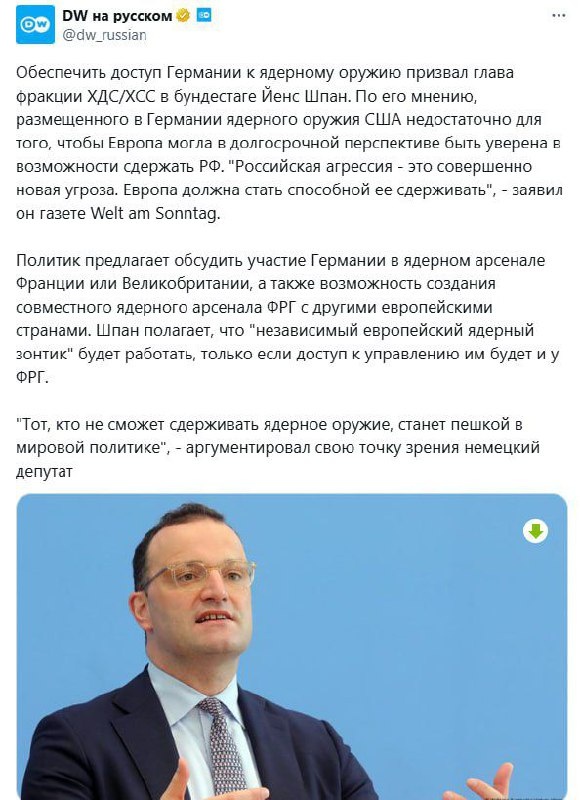 Обеспечить доступ Германии к ядерному оружию призвал глава фракции ХДС/ХСС в бундестаге Йенс Шпан. По его мнению, размещенного в Германии ядерного оружия США недостаточно для того, чтобы Европа могла в долгосрочной перспективе быть уверена в возможности сдержать РФ. "Российская агрессия - это совершенно новая угроза. Европа должна стать способной ее сдерживать", - заявил он газете Welt am Sonntag. Политик предлагает обсудить участие Германии в ядерном арсенале Франции или Великобритании, а также возможность создания совместного ядерного арсенала ФРГ с другими европейскими странами. Шпан полагает, что "независимый европейский ядерный зонтик" против России будет работать, только если доступ к управлению им будет и у ФРГ. "Тот, кто не сможет сдерживать ядерное оружие, станет пешкой в мировой политике", - аргументировал свою точку зрения немецкий депутат