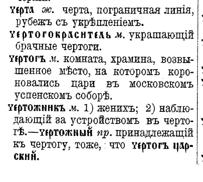Но вот уж близко. Перед ними Уж белокаменной Москвы Как жар, крестами золотыми Горят старинные главы. Ах, братцы! как я был доволен, Когда церквей и колоколен, Садов, чертогов полукруг Открылся предо мною вдруг! А.С. Пушкин "Евгений Онегин". В старославянском: Официальная этимология относит к тюркскому происхождению со значением дворца: "вероятно, является заимствованием из тюркских, восходящим к персидскому первоисточнику cartak, крым.-тат. čаrdаk «балкон», где оно — из сложения čār «четыре» и tāk «столб» Звук [ч] произошел от сочетания KwT. (KwT)JAJRTAAWG Смотреть статью ЧЕТЫРЕ: https://dzen.ru/a/Zs6dgTldoBAeeaJB Родственность со значением "черта" (граница) дает понимание некоего ограниченного под какие-то задачи пространства (защищенного). Например, спальня (опочивальня). В момент сна человек становится беззащитным, поэтому пространство спальни должно быть защищено. Также в момент зачатия новой жизни. Вероятнее всего граница очерчивалась по траектории сферы, кольца, правильного м