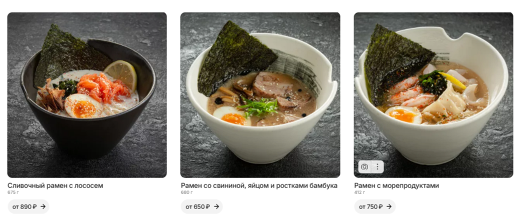 густой сливочный бульон, нежная рыба, хрустящие водоросли вакаме, пикантная стружка тунца и упругая лапша. С лимоном для свежести и маринованным яйцом для насыщенности. Орехово-кунжутный рамен Ароматный бульон с насыщенным вкусом обжаренного кунжута и грецких орехов. Нежный говяжий фарш, тушёный с древесными грибами шиитаке, дополнен свежими листьями шпината. Остроту приправы шичими тогараши завершают композицию, добавляя лёгкий жгучий акцент Роллы Да, Ikigai