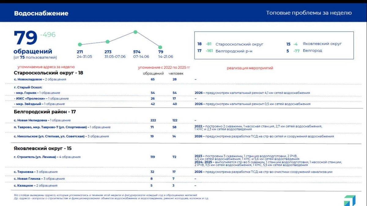 С похолоданием в Белгородской области стало меньше жалоб на водоснабжение По итогам заседания Правительства области, лидер по обращениям — Новая Нелидовка Белгородского района: с 2022 года 122 человека оставили 222 обращения. От 58 жителей Таврово Белгородского района — более 70 обращений. Там в 2022 году построили 2 скважины, 1 насосную станцию, 2,7 км сетей водоснабжения, 1 канализационную насосную станцию и 2,3 км сетей водоотведения.