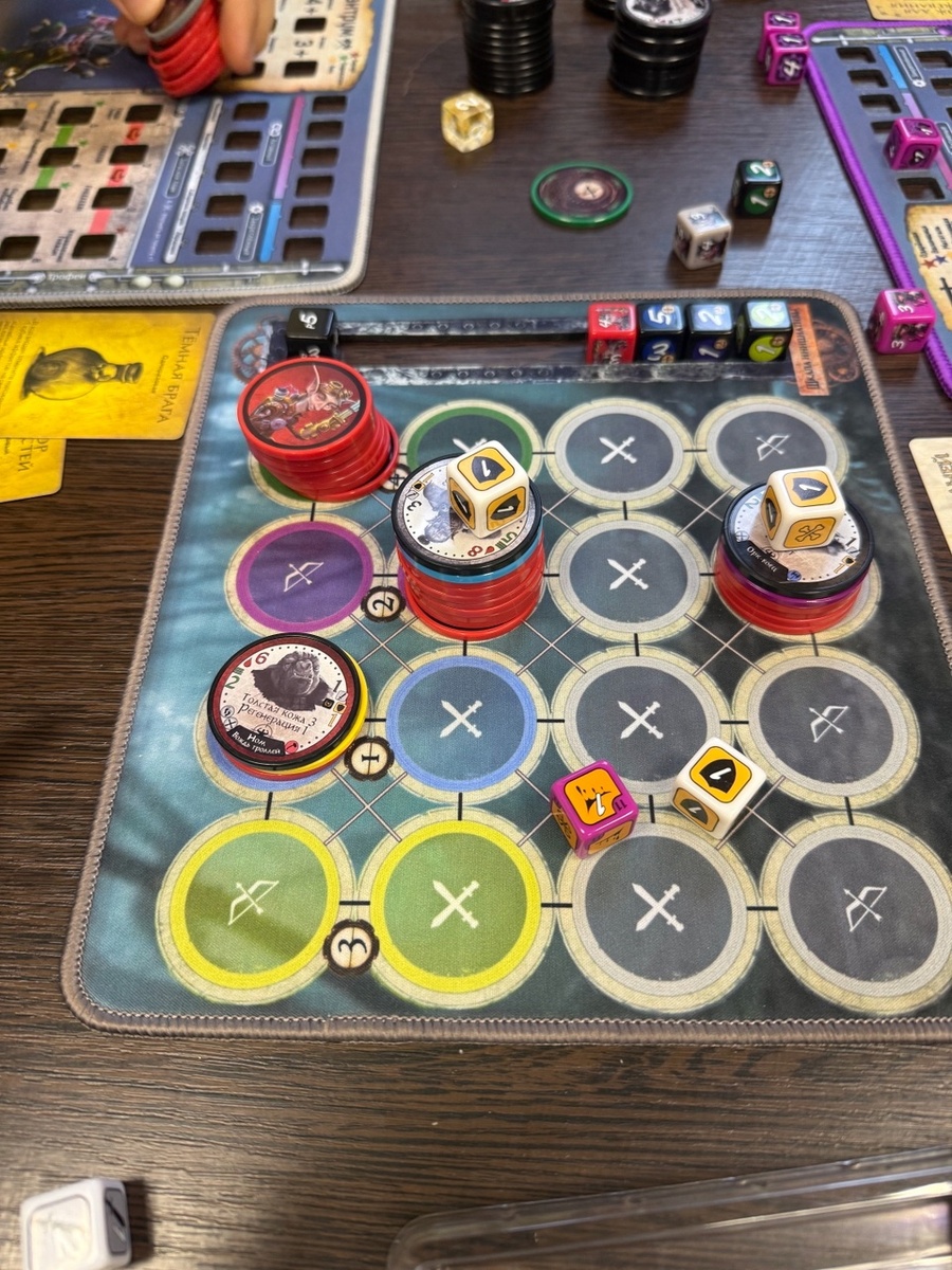 В какой-то момент наша партия растянулась почти на два часа перманентного швыряния кубов с переменным успехом: то 1 команда не выкидывает ни 1 успеха на жмени кубов, то другая с россыпи жёлтых кубиков с минимальным шансом на попадание выкидывает все раны. При этом за убийства фишки убитых то и дело возвращались в бой - только вам вышибают персонажа на с 7 хп, вы тут же воскрешаете его, снова вводите в бой, обмазываете его пассивками и все происходит по новой.....