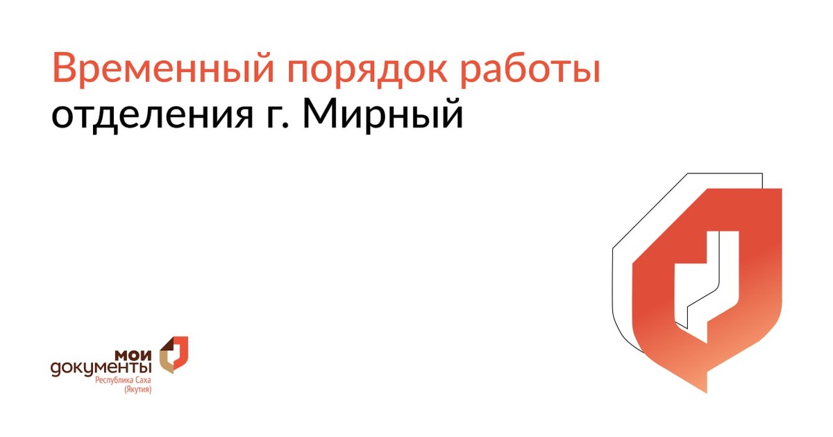 ❗️❗️❗️❗️❗️ Временный порядок работы офиса центра "Мои Документы" г. Мирный🔔 С 7 июля 2025 года прием в офисе г. Мирный Мирнинского района осуществляется исключительно по предварительной записи. 🔔Со 2 июля 2025 года установлен следующий режим работы: ➡️вторник - пятница: с 09:00 - 18:00 - прием заявителей; ➡️суббота: с 09:00 - 13:00 - прием заявителей. 🌐Записаться на прием: https://mfcsakha.ru/queuesignna Талоны предварительной записи доступны за 5 (пять) календарных дней (для районных отделений).