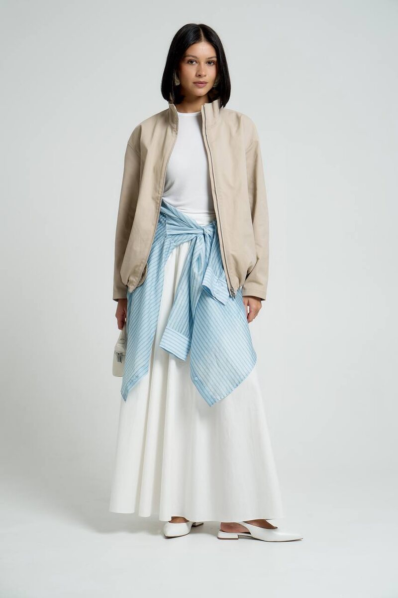 Многослойный образ для переменчивого лета от стилиста Kristina&Milan ☁️🩵 Сочетание белого и голубого всегда выглядит очень свежо 🤌🏻 Для верхнего слоя используем песочный легкий бомбер с воротником-стойкой, который можно либо застегнуть на молнию, если прохладно, либо снять, если стало жарко. Под ним – базовая белая футболка и белая макси юбка А-силуэта в пол. Делает образ интереснее за счет эффекта многослойности, драпировок и асимметрии— голубая рубашка, повязанная на талии. Ее можно оставить как акцент или же использовать как верхний слой вместо бомбера 🙌🏼 Завершаем образ идеальной парой для переменчивой летней погоды: белоснежными слингбэками с закрытым мысом и открытой пяткой, поддерживаемой ремешком.