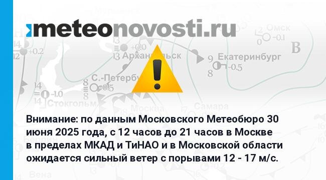 Внимание: по данным Московского Метеобюро 30 июня 2025 года, с 12 часов до 21 часов в Москве в пределах МКАД и ТиНАО и в Московской области ожидается сильный ветер с порывами 12 - 17 м/с.