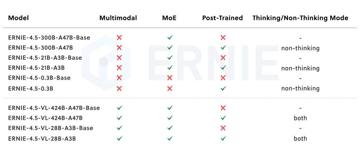ΠΏΠ°ΡΠ°ΠΌΠ΅ΡΡΠΎΠ², - ΡΠ°ΠΌΠ°Ρ ΠΊΡΡΠΏΠ½Π°Ρ ΠΌΠΎΠ΄Π΅Π»Ρ ΡΠΎΠ΄Π΅ΡΠΆΠΈΡ 424B ΠΏΠ°ΡΠ°ΠΌΠ΅ΡΡΠΎΠ² (MoE), - ΡΠ°ΠΊΠΆΠ΅ Π΄ΠΎΡΡΡΠΏΠ½Π° ΠΊΠΎΠΌΠΏΠ°ΠΊΡΠ½Π°Ρ denseβΠ²Π΅ΡΡΠΈΡ Π½Π° 0.3B. ΠΡΠ΅Π³ΠΎ Baidu Π²ΡΠ»ΠΎΠΆΠΈΠ»Π° ΡΡΠ°Π·Ρ 23 ΠΌΠΎΠ΄Π΅Π»ΠΈ Π½Π° Hugging Face ΡΠ°Π·ΠΌΠ΅ΡΠ°ΠΌΠΈ β ΠΎΡ 0.3B Π΄ΠΎ 424B ΠΏΠ°ΡΠ°ΠΌΠ΅ΡΡΠΎΠ²! π₯ π’ΠΠΎΠΏΡΠΎΠ±ΠΎΠ²Π°ΡΡ: http://ernie.baidu.com π’Hugging Face: https://huggingface.co/baidu π’GitHub: https://github.com/PaddlePaddle/ERNIE π’AI Studio: https://aistudio.baidu.com/overview @machinelearning #ERNIE #opensource #Baidu