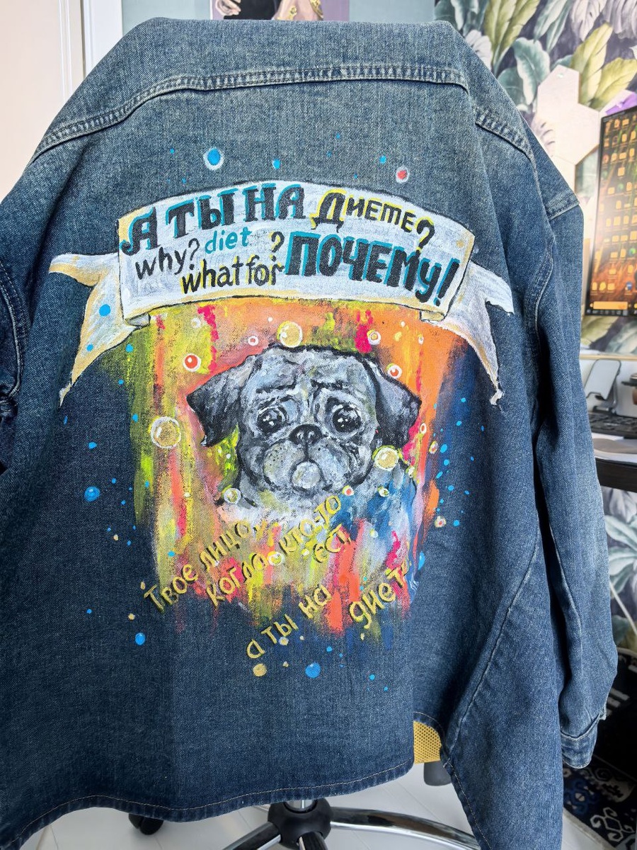 Я просто не могу не показать вам эту шикарнейшую джинсовую куртку - подарок от моей пациентки ❤️ ручная работа и еще и с мопсом!