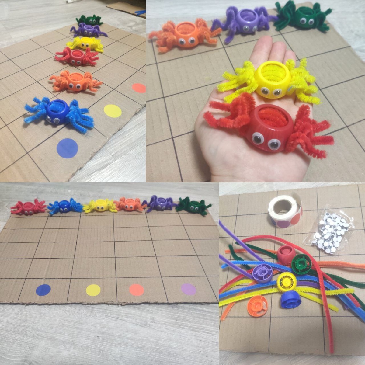 🌙 Пока дети спят, мамы творят! 🎨 Сегодня я решила сделать свою первую настольную игру "Паучки". В ход идут все подручные материалы: картон, синельная проволока, фрутокрышки и глазки.