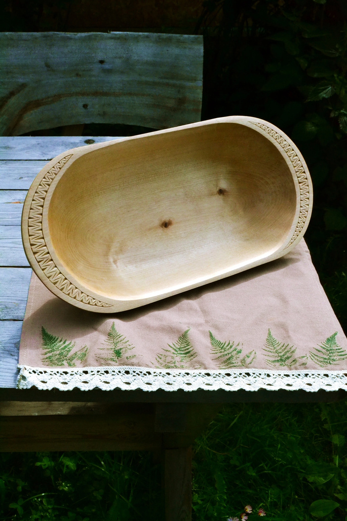Наконец доделал это блюдо. Дело, как видите, не быстрое. В позапрошлом посте показывал, как делаю черновую зарубку. После этого была бережная сушка в газетах почти месяц, резьба начистовую, шлифовка, простенький орнамент. После финишной обработки маслом тоже нужно некоторое время для его полимеризации. И вот, блюдо готово. Размер получился довольно внушительный - 42х20 см. В пару к нему напросился ковшик Не то чтобы это неделимый комплект, просто орнаменты получились похожи и пара неплохо смотрится вместе. Ковш это долгострой. Вырезал я его три года назад, оставил на недельку сушиться и так и забросил. Недавно решил всё же привести недоделки в порядок, дошли руки в том числе и до этого ковша. Подписаться на Пикабу Познавательный. и Пикабу: Истории из жизни.