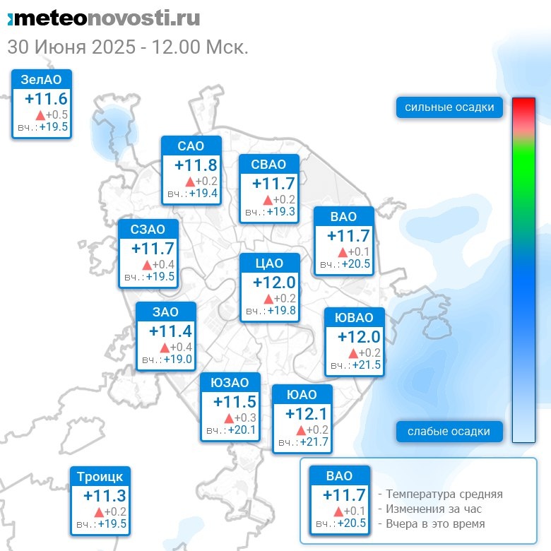 В 12:00 в Москве было от +10.9°C до +12.5°C, средняя температура +11.8°C #погода #Москва #лето #температура #30июня #понедельник
