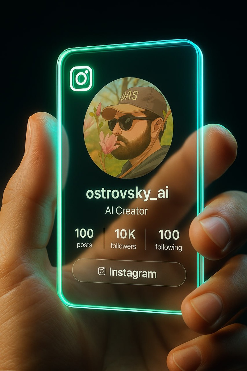 Как создать такое изображение? ⬇️Шаблон промта ниже Create an ultra-realistic 3D digital visualization of a futuristic Instagram profile postcard in high resolution, which you carefully hold between your thumb and forefinger. The card is made of luminous transparent glass with glowing neon green and blue edges, which gently illuminate the fingers and create a gentle glow. Place the glowing Instagram icon in the upper-left corner. Place a round profile picture in the center. Just below the image, add the name [твой текст], in bold, without serifs. Under the title, print the title [твой текст] in a smaller and lighter font. Instagram's Instagram icon is located in the center of the page and fits it clearly into the design using the Instagram icon to the left of the image, which will be colored in the same color as the text in Instagram. Next, arrange the three social media statistics in a clean horizontal row using minimalistic, legible fonts, such as 100 posts, 10,000 followers, and 10