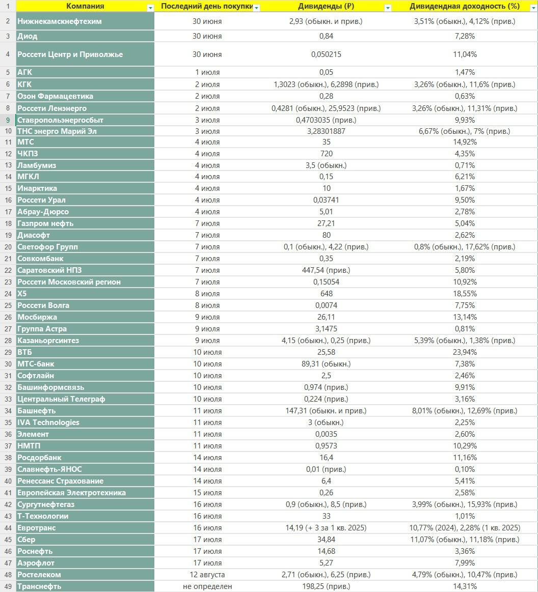 Π‘ΠΎΠ±ΡΠ°Π» Π΄Π»Ρ Π²Π°Ρ ΡΠΏΠΈΡΠΎΠΊ ΠΊΠΎΠΌΠΏΠ°Π½ΠΈΠΉ, ΠΊΠΎΡΠΎΡΡΠ΅ Π²ΡΠΏΠ»Π°ΡΠΈΠ²Π°ΡΡ Π΄ΠΈΠ²ΠΈΠ΄Π΅Π½Π΄Ρ ΠΎΡ 30 ΠΈΡΠ½Ρ Π΄ΠΎ ΡΠ΅ΡΠ΅Π΄ΠΈΠ½Ρ Π°Π²Π³ΡΡΡΠ°. Π‘Π΄Π΅Π»Π°Π» 2 ΡΠ°Π±Π»ΠΈΡΠΊΠΈ: ΠΏΠ΅ΡΠ²Π°Ρ Ρ ΡΠΎΡΡΠΈΡΠΎΠ²ΠΊΠΎΠΉ ΠΏΠΎ Π΄Π°ΡΠ΅, Π²ΡΠΎΡΠ°Ρ ΠΏΠΎ ΡΠ°Π·ΠΌΠ΅ΡΡ Π΄ΠΈΠ²ΠΈΠ΄Π΅Π½Π΄Π½ΠΎΠΉ Π΄ΠΎΡ