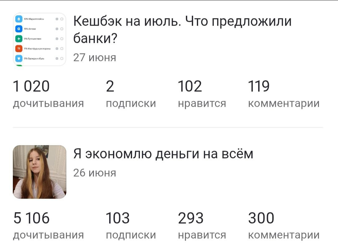 К примеру, статья про кешбэк от банков принесла мне 2 подписки на канал, а статья про то, как я экономлю деньги на всём – 103 подписки. Огромная разница.