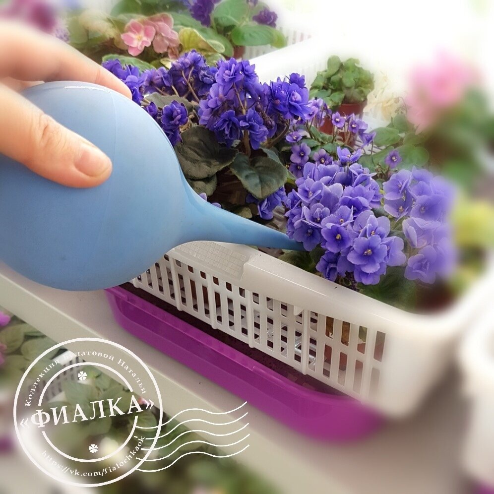 У вас такое бывает, что вопрос, который задает начинающий цветовод, ставит вас в тупик? Меня вот так в свое время озадачил вопрос: "А, как вы их поливаете?". Именно "как", а не "когда"! До этого момента даже не задумывалась, чем же я пользуюсь при поливе. У меня все растения на фитильном поливе. Так, чем же я пользовалась, чтобы вся эта система работала? Сейчас у меня уже все иначе, но, если у вас совсем небольшая коллекция, то записывайте: 1. Спринцовка (или по простонародному "клизма"). Ею удобно поливать фиалочки сверху. Если, к примеру, фитиль еще не заработал, а грунт подсох. Можно из нее доливать раствор в маленькие баночки. А еще спринцовкой можно "откачать" излишки воды после полива, которые стекли в поддон. Тоже очень полезная функция. 2. Лейка. Она у меня для долива раствора в общие фитильные ёмкости. Обычно, стараюсь сильно не пересушивать. В один кошачий лоток на долив у меня уходит одна лейка (почти половина объёма лотка). 3. Различные мерные стаканчики. Самый мелкий для д