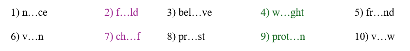 Автоматическая проверка в Word может избаловать кого угодно! И что самое ужасное – давно уже избаловала. Что мы реально вспомним без её помощи? А теперь давайте договоримся. Сегодня я предлагаю вам 50 слов, в которых нужно заполнить пропуски сочетаниями букв ie и ei. При выполнении этого задания вы не должны пользоваться автопроверкой и словарями– пора проверить свои настоящие знания! Уровень 1. Уровень 1. Ответы. 1) niece, 2) field, 3) believe, 4) weight, 5) friend 6) vein, 7) chief, 8) priest, 9) protein, 10) view Уровень 2. Уровень 2. Ответы. 1) foreign, 2) thief, 3) brief, 4) neighbour, 5) ceiling 6) science, 7) neither, 8) sleigh, 9) cashier, 10) caffeine Уровень 3. Уровень 3. Ответы. 1) height, 2) receipt, 3) quiet, 4) shriek, 5) ancient 6) sheikh, 7) handkerchief, 8) hygiene, 9) receive, 10) rein Уровень 4. Уровень 4. Ответы. 1) grief, 2) yield, 3) beige, 4) pierce, 5) weird 6) relief, 7) reins, 8) diesel, 9) heir, 10) seize Уровень 5. Уровень 5. Ответы. 1) mischievous,