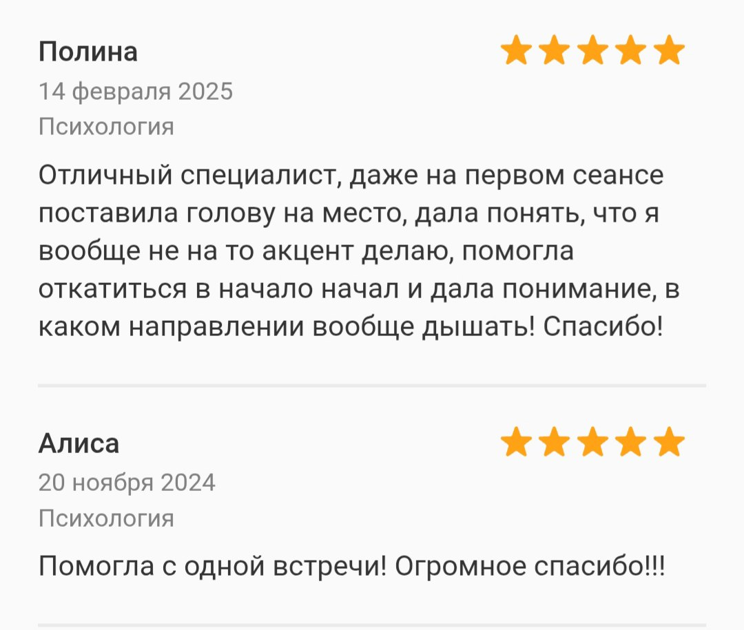 Дорогие друзья, у меня отличные новости! Теперь вы можете записаться ко мне на консультацию через Профи.ру — проверенный и безопасный сервис, который заботится о качестве представленных экспертов. • 🛡️ Безопасность. Профи.ру тщательно проверяет всех специалистов, представленных на платформе, что гарантирует вашу безопасность и уверенность в качестве услуг. • ⭐️ Отзывы. На моей странице на Профи.ру вы найдете множество отзывов от моих клиентов, которые уже прошли консультации и зажили свою лучшую жизнь! • 🤝 Удобство. Запись на консультацию стала еще проще и удобнее! Вы можете выбрать подходящее время и формат, а также ознакомиться с ценами и условиями заранее. На фото показала парочку отзывов с этого сервиса)