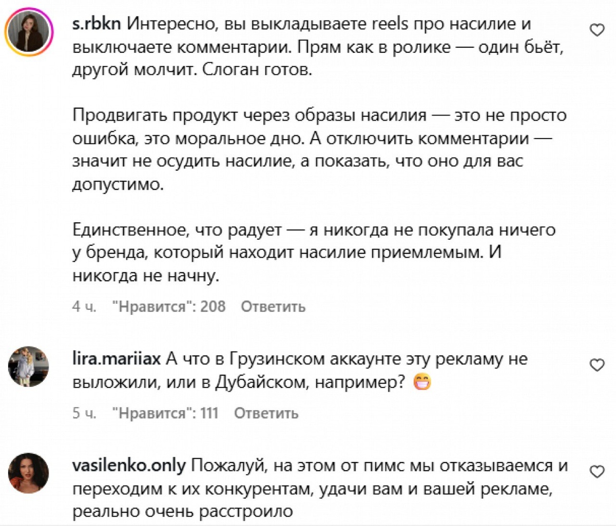 Попивая домашний чай наблюдаю за развитием скандала с Pims На днях Pims в своих соцсетях выпустили ролик, где мужчина грубо прижимает девушку к стеклу и обыскивает ее. А, и попутно оголяет. По заветам Monochrome компания и не думала извиняться. Мол, мы не за насилие, это вы все неправильно поняли, мы вообще добрые и хорошие. По классике жанра после начала хейта smmщики закрыли комментарии. Изначально компания заявляла, что этот ролик – первая часть в их мини-сериале. Позже выпустили такое же видео, но жертвой на этот раз стал парень. Сейчас провокационные посты удалены. Но Интернет помнит все, ребятки. Продолжение истории нашлось в телеграм-канале креативнодиректорская. Анастасия опубликовала эксклюзивные ответы Pims насчет этого скандала. Почитать можно здесь, а я расскажу кратко: ❤️Pims это не бренд для подростков. Минус большая хорошая аудитория, которая сильно добавляет виральности и популярности. ❤️Pims отключили комментарии не потому, что боятся хейта и отмены, а потому что