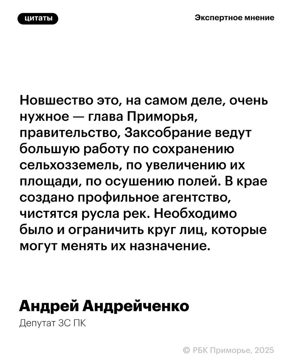 В Приморье изменился порядок вывода земель сельхозназначения в другие категории — с 1 марта 2026 года это возможно будет сделать только по законодательной инициативе главы Приморья Соответствующие поправки приняли депутаты Законодательного собрания края на июньской сессии. Отмечается, что это позволит предотвратить сокращение площади сельхозугодий и внесет свой вклад в развитие отрасли в регионе. 😃Подписывайтесь на РБК Восток