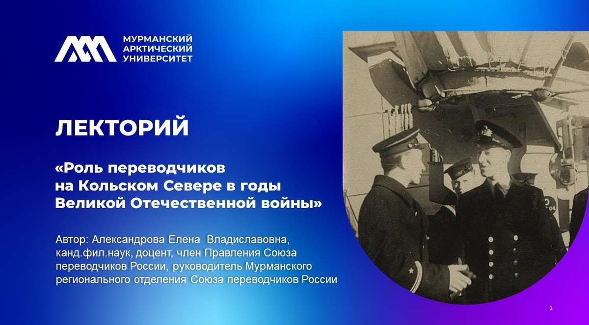 Лекция "Роль переводчиков на Кольском Севере в годы Великой Отечественной войны" канд.филол.наук, заведующего кафедрой иностранных языков Мурманского арктического университета, члена Правления Союза переводчиков России, руководителя Мурманского регионального отделения Союза переводчиков России Елены Александровой посвящена рассмотрению специфики организации переводческой деятельности в Мурманской области в годы Великой Отечественной войны. Стратегическое положение города Мурманска и его незамерзающий порт сыграли важную роль в годы Великой Отечественной войны – город стал ключевым логистическим центром, через который осуществлялась поставка военных и стратегических грузов от союзников по программе ленд-лиза. В Мурманске и Полярном были размещены британская миссия и аппарат помощника американского военно-морского атташе. В таких условиях особую важность приобрело знание иностранных языков, в особенности английского. Среди внутренних документов штаба Северного флота есть распоряжение,
