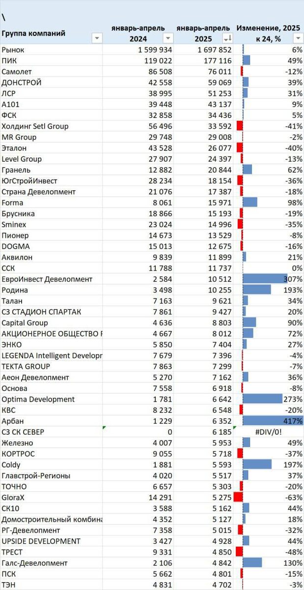 За январь-апрель 2025 года застройщики РФ продали жилья на 1,698 трлн рублей — на 6% больше, чем годом ранее Так, в 2025 году ПИК продал жилой недвижимости на 49% больше, чем за тот же период в 2024-м, — 177 млрд рублей. Также продажи сильно выросли и у «Донстроя» — на 39%, до 59 млрд. Примечательно, что у Forma продажи выросли на 98% и достигли 15,9 млрд. При этом у «Самолета» показатель снизился за год на 12%, до 76 млрд рублей, а у ТОЧНО — на 20%, до 5,3 млрд. 📈ТОП застройщиков по увеличению объемов продаж год к году: • Арбан (+417%, до 6,4 млрд рублей); • Евроинвест Девелопмент (+307%, до 10,5 млрд); • Optima Development (+273%, до 6,6 млрд); • Coldy (+197%, до 5,6 млрд); • «Родина» (+193%, до 10,3 млрд). 📉ТОП застройщиков по падению объемов продаж год к году: • GloraX (-63% по сравнению с четырьмя месяцами 2024-го, до 5,3 млрд рублей); • ТРЕСТ (-48%, до 4,9 млрд рублей); • Группа «Эталон» (-41%, до 26 млрд рублей); • Холдинг Setl Group (-40%, до 33,6 млрд); • «КОРТРОС» (-37%,