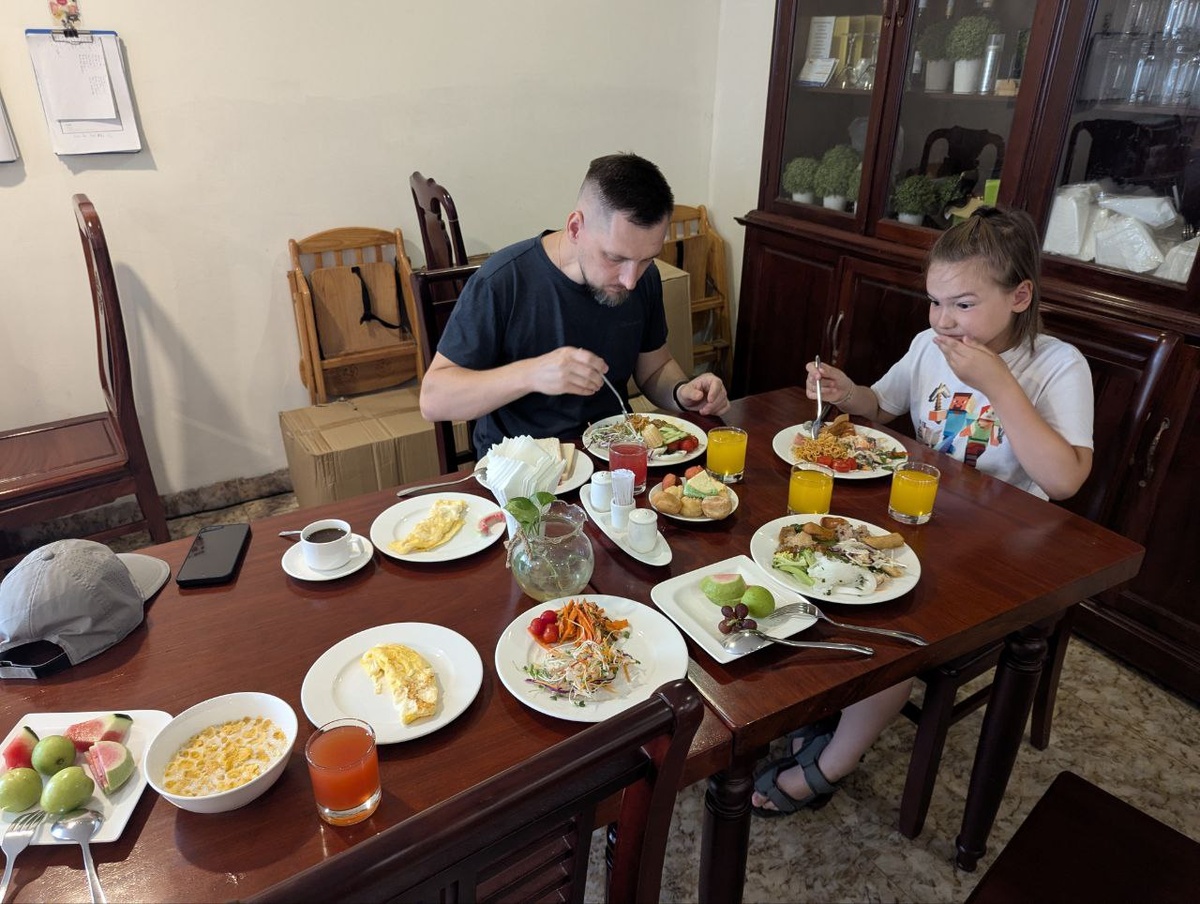 Завтрак. Вьетнам. День 2. 30.06.2025 Шведский стол-великолепеное решение для отелей. Особенно он интересен в новых странах. Есть возможность попробовать разные блюда и в разных количествах. Я в таком случае обычно беру всего помаленьку, чтобы просто попробовать, понравится или нет. Таким образом определяется фавориты на оставшиеся дни. В кафе такой вариант не прокатит, так как ты в любом случае берёшь блюдо в полной порции. Не всё нравится, не все заходит. По поводу вкуса именно в этом отеле, могу сказать, что блюда скорее нейтральные чем какие-то. В большинстве, если не во всех, вообще нет соли. т.е. те же овощи, рис, лапша и т.д. они вообще не солёные. На столе есть соусы и заправки, от привычного нам "кечинеза", до острой заправки с перцем чили. По фруктам на завтрак.. Могу с уверенностью сказать, что ещё ни в одном ресторане при отеле не давали нормальные вкусные фрукты. И особенно это удивляет в тех странах, где они растут в большом количестве. А ещё, здесь летают гигантски