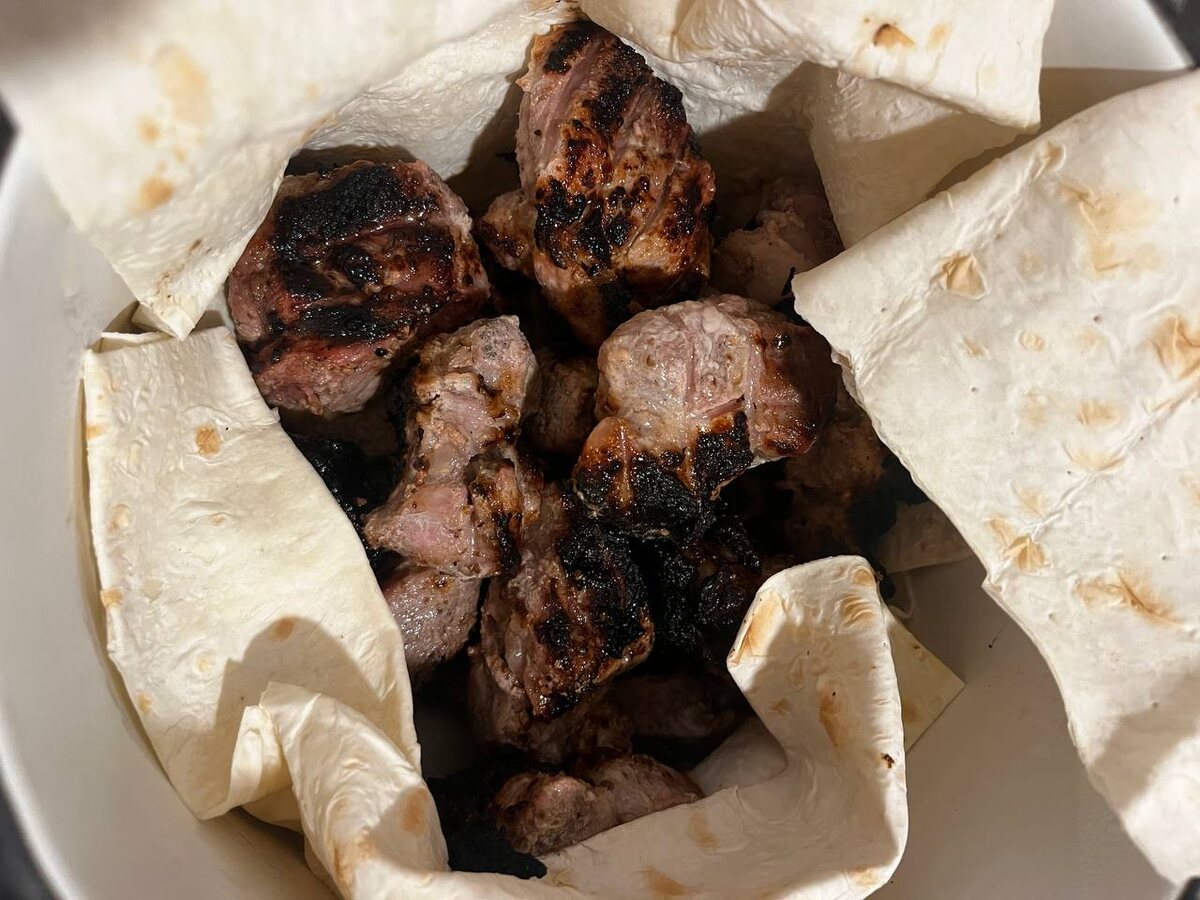 Если вы сделаете всё по этому рецепту, шашлык получится сочным, мягким и очень вкусным, а времени на подготовку уйдёт совсем немного. Я взяла свиную шейку — идеальный вариант для шашлыка. Муж нарезал мясо крупными кусками (ибо как пишут комментаторы в ДЗЕН "женщину к подготовке шашлыка подпускать нельзя"🤣). Мясо мы залили кефиром и добавили специи. Обычно я кладу приправу тандури, но в этот раз её не оказалось под рукой, поэтому использовала смесь приправ для мяса. Всё хорошо перемешала и оставила мариноваться в глубокой сковородке — другой посуды под рукой просто не было. Лучше всего оставить маринад на ночь в холодильнике. Если времени мало — можно замариновать с утра и жарить вечером. Главное, чтобы мясо хорошо пропиталось. Готовое мясо нанизываем на шампуры или выкладываем на решётку — подойдёт любой способ. Мы иногда и такие крупные куски жарим на решётке, получается отлично. Теперь про соус. В этот раз я решила не заморачиваться и просто смешала сметану с универсальной приправой