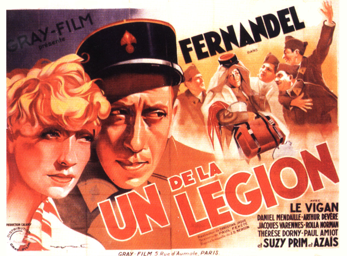 Один из легиона / Un de la légion. Франция, 1936. Режиссер Кристиан-Жак. Сценаристы: Дж. Д. Ньюсом, Поль Фекете. Актеры: Фернандель, Робер Ле Виган, Даниэль Мендаль и др. Приключенческая комедия. Премьера: 18.09.1936. Прокат во Франции: 4,0 млн. зрителей. В этой комедии персонаж Фернанделя женат на властной женщине. Но вот однажды его «вырубают» в баре, а потом обманом зачисляют в Иностранный легион под чужим именем… Как писал знаток французского кино, киновед Александр Брагинский (1920-2016), «Иностранный легион не внушал симпатий Кристиан-Жаку с детства. Он знал, что его дед, Клеман Моде, был знаменосцем Иностранного легиона и погиб в битве при Камероне в Мексике в 1863 году. ... Авторы фильма откровенно смеются над обывателем, штафиркой, который неожиданно «раскрывается» под пулями почти как герой, хотя в быту не имеет сил приручить свою благоверную Тутуну. Это был подлинный герой поневоле, решенный в традициях мольеровской комедии нравов. Убедительность персонажа, его узнаваем