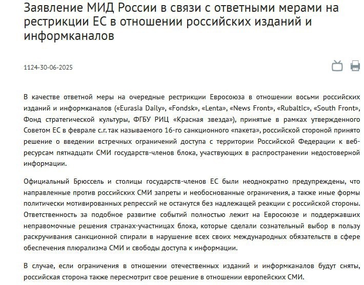 Россия в ответ на европейские санкции против СМИ вводит встречные ограничения на работу 15 европейских ресурсов, сообщил МИД РФ