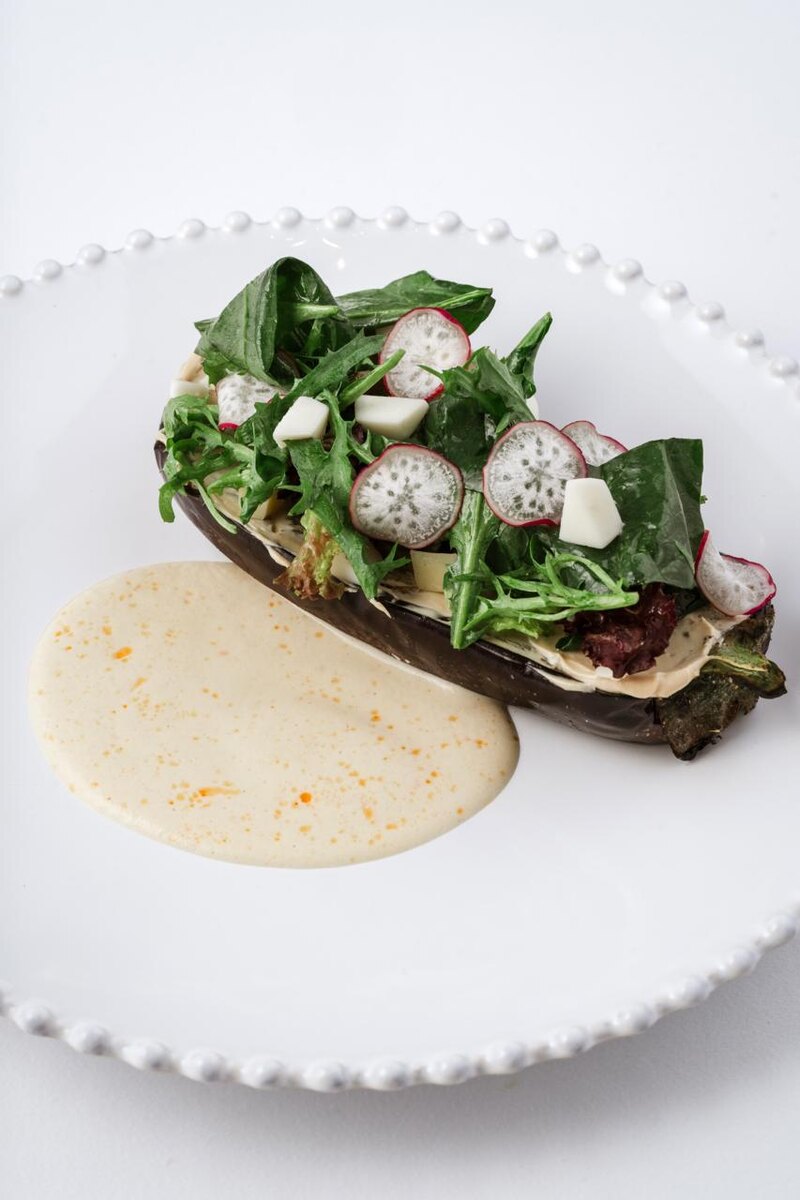 В основной карте — тунец с арбузом, томатный маршмеллоу с фетой и красной икрой (да, это закуска), краб в кокосовой глазури, палтус на огне, тарт с лососем и морковным соусом, шоколадный «стейк» и говяжьи рёбра с шоу-подачей на коньяке.