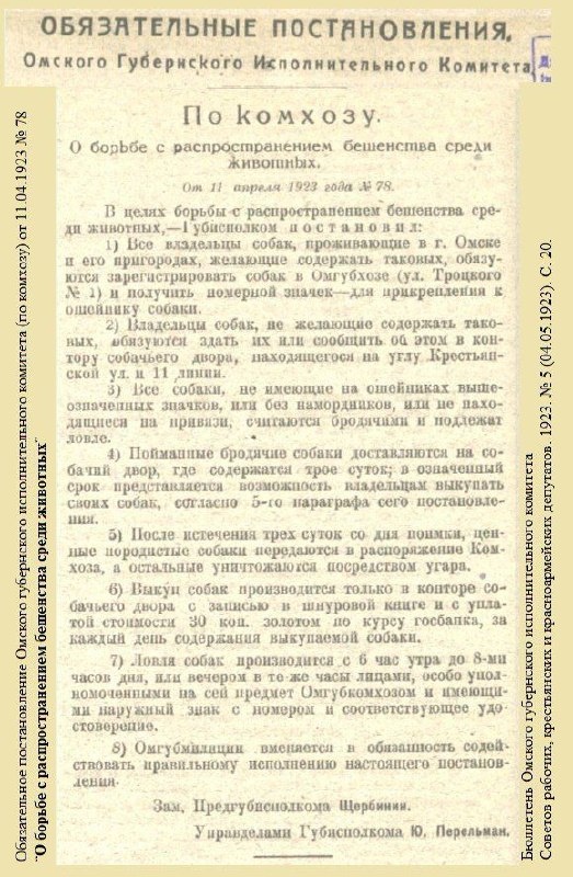 ❗КТО В ОТВЕТЕ ЗА БЕЗДОМНЫХ ЖИВОТНЫХ?Ответ на этот вопрос был найден более века назад! В 1923 году для борьбы с бешенством в Омске были приняты строгие меры. Владельцы собак обязаны были зарегистрировать своих питомцев в Омгубхозе и получить специальный значок для ошейника. Тем, кто не хотел содержать собак, предлагалось сдать их в собачий двор. Без значков и намордников животные считались бродячими и подлежали отлову. Пойманные собаки содержались три дня, после чего ценным породистым животным находили новое место, а остальные уничтожались. Выкупать собак можно было только в специальной конторе за плату. Ловля проводилась уполномоченными лицами, а милиция следила за выполнением указаний. Эти меры стали необходимыми для предотвращения распространения болезни, угрожающей как животным, так и людям. ⁉А как вы относитесь к таким мерам борьбы с опасностями, которые несут бездомные животные?