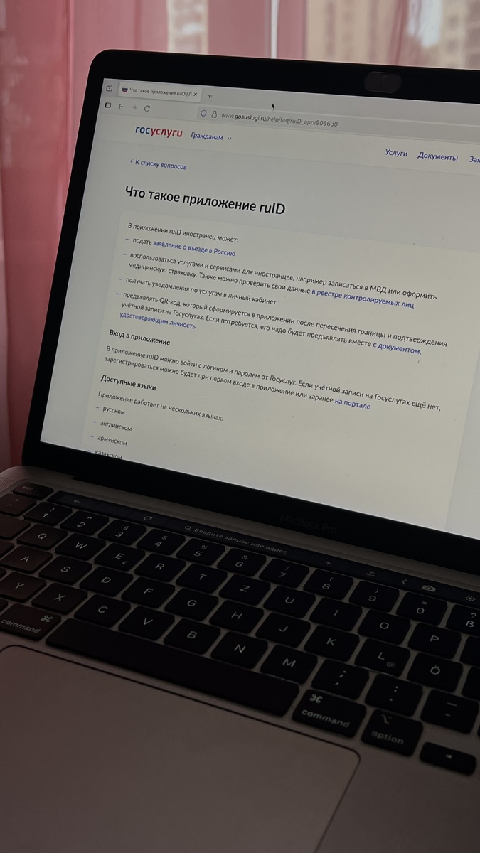 Через него подаётся заявление о въезде, узнаёшь об ограничениях и в нём создаёшь цифровой профиль для получения госуслуг. Можно отправить заявление о безвизовом въезде и в приложении : Сфотографироваться. Сделать фото документа, удостоверяющего личность. Записать голос. Дождаться проверки данных. Заявление не нужно оформлять: гражданам Республики Беларусь; детям до 6 лет; дипломатам и сотрудникам консульств; сотрудникам международных организаций, аккредитованных в России, и членам их семей. Что будет на границе: Проверят данные из заявления. Создаётся цифровой профиль. Присваивают СНИЛС и учётную запись Госуслуг. Эти данные пригодятся, например, для оформления сим-карты. В будущем через ruID можно будет получать больше услуг. Скачать приложение ruID можно в RuStore, Google Play, AppGallery, App Store.