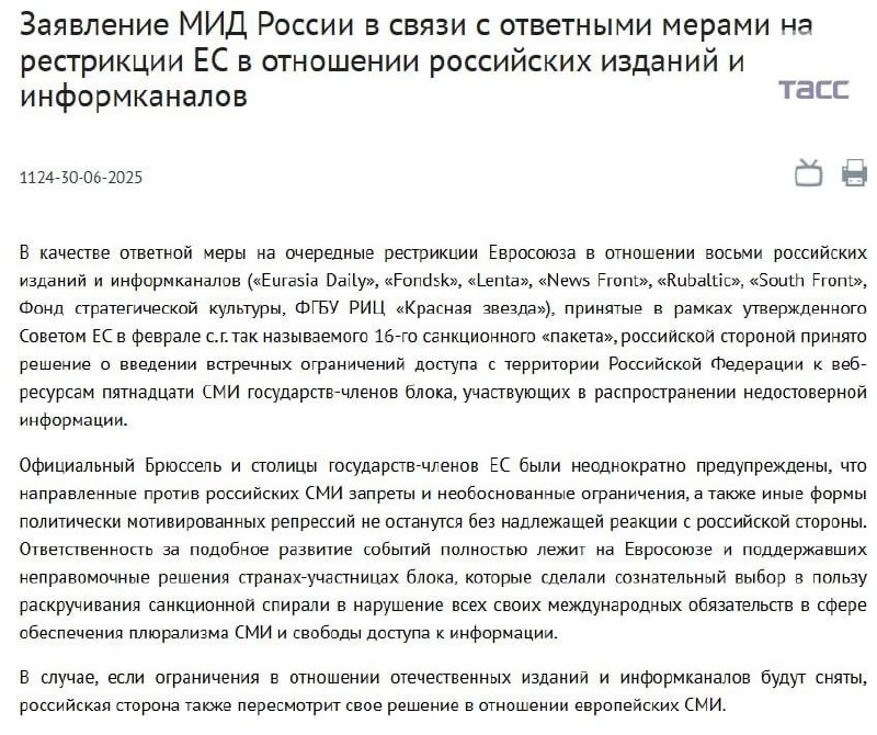 Россия вводит ограничение доступа на своей территории к веб-ресурсам пятнадцати СМИ государств ЕС, — МИД РФ. РФ пересмотрит свое решение в отношении европейских СМИ, если будут сняты ограничения в отношении российских, отметили в МИД. Заря | Новости - Подписаться
