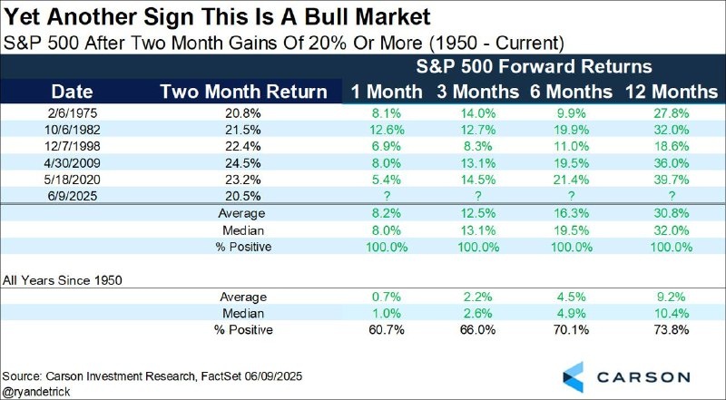 Сейчас мы наблюдаем всего 6-й случай с 1950 г., когда индекс S&P-500 за 2 месяца прибавляет от 20% и выше. Формально это про… Сейчас мы наблюдаем всего 6-й случай с 1950 г., когда индекс S&P-500 за 2 месяца прибавляет от 20% и выше. Формально это произошло еще 9-го июня. Во всех пяти предыдущих случаях рынок был заметно выше через 1,3,6 и 12 месяцев, по данным Carson Research. Честно говоря, не уверен пока насчет 12 месяцев, но вот до конца 2025 года «попутный ветер», вероятно, сохранится и довольно сильный. Это не говорит о том, что рынок продолжит расти без пауз или коррекций, но позволяет предположить, что как минимум до конца этого года он останется в режиме «покупать на откатах». #фондовый_рынок #инвестиции #финансы #акции Сообщение [blog.neotorg-line.ru|Сейчас мы наблюдаем всего 6-й случай с 1950 г., когда индекс S&P-500 за 2 месяца прибавляет от 20% и выше. Формально это про…] появились сначала на НЕОТОРГ - портал аналитики по фондовому рынку. #брокер #альтернативныеинвести